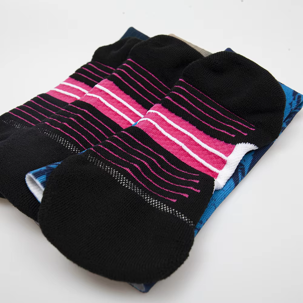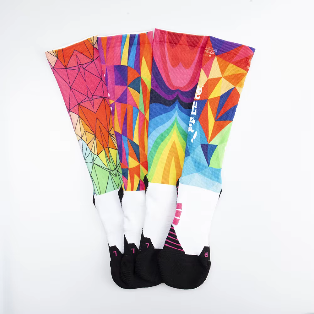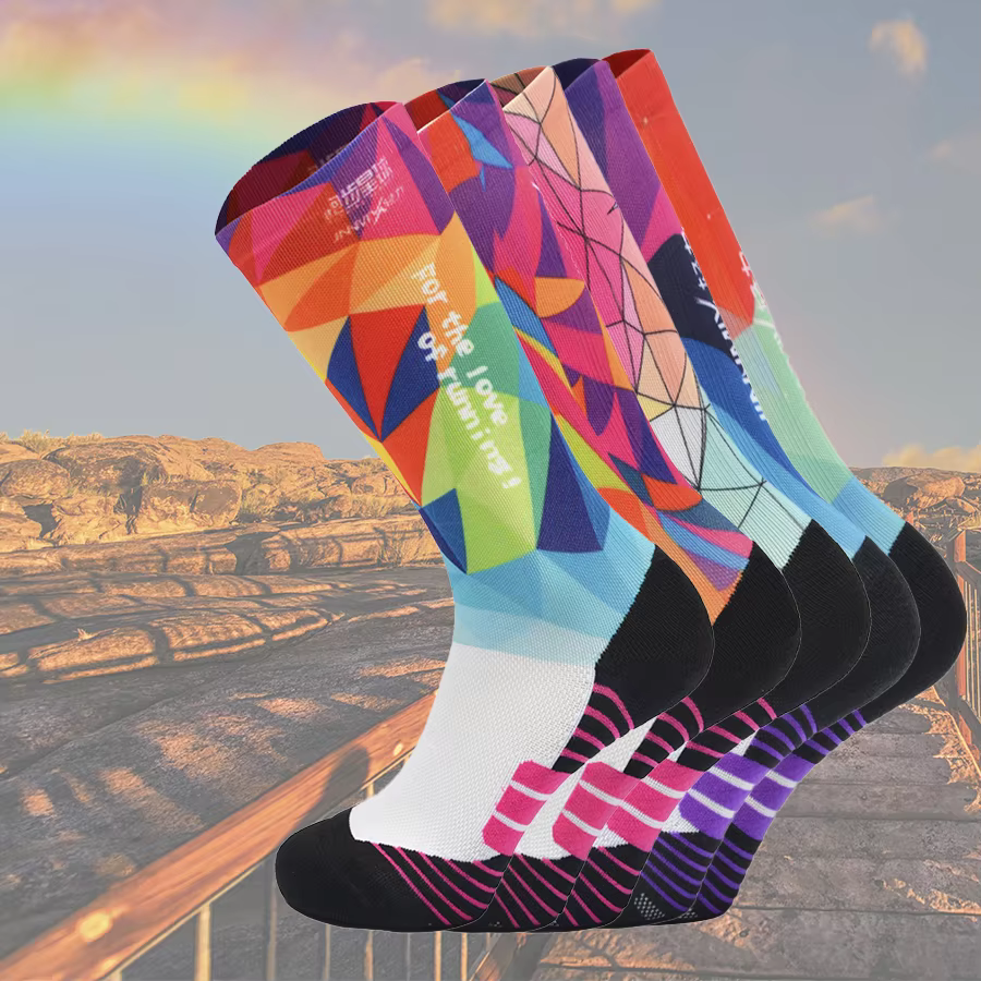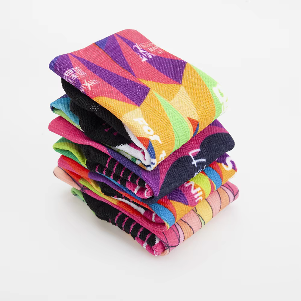 Superior Comfort: Smoothness Against the Skin: A jacquard sock, by its nature, has an interior filled with floating yarns and small knots where different colored threads interlace. These can create pressure points and cause irritation, especially during prolonged wear or physical activity. In contrast, a digitally printed sock is knit as a single, uniform base fabric (often a smooth jersey stitch). The printing occurs on the exterior, leaving the interior perfectly smooth and free of any obstructive textures, offering a ""second-skin"" feel that prioritizes wearer comfort.
