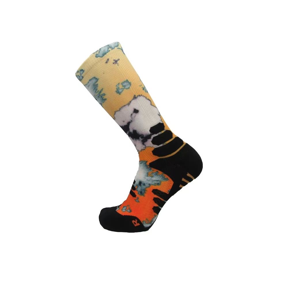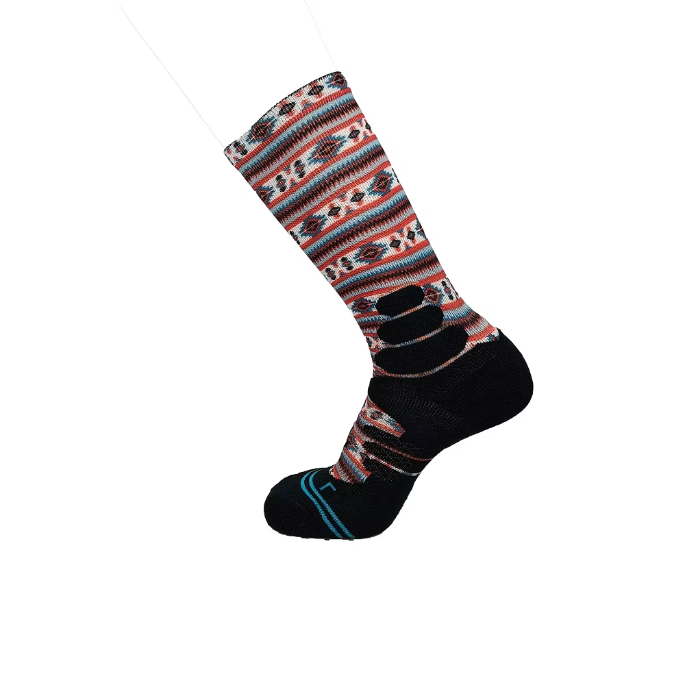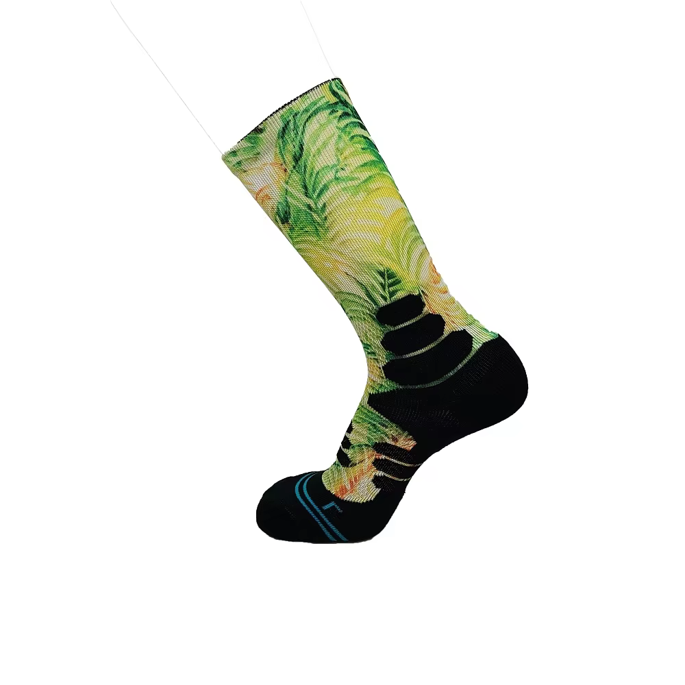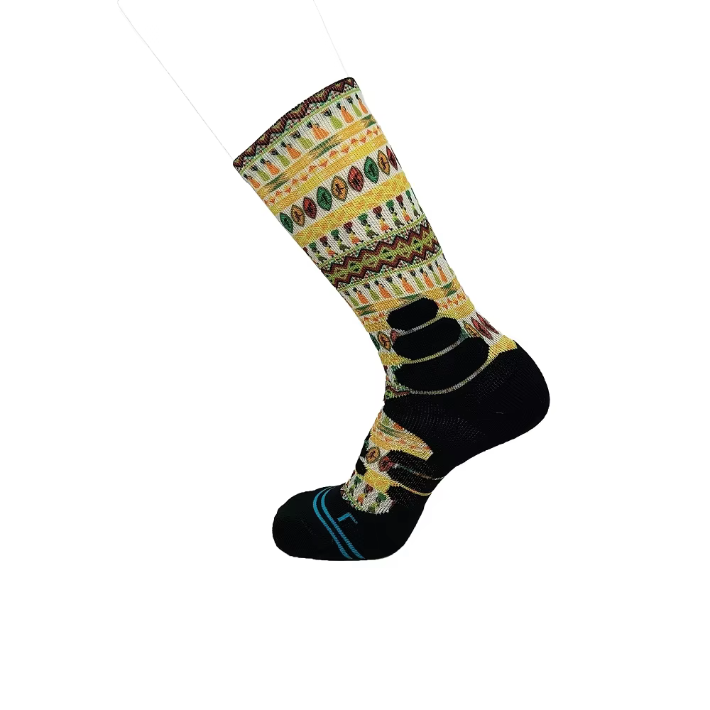 Superior Comfort: Smoothness Against the Skin: A jacquard sock, by its nature, has an interior filled with floating yarns and small knots where different colored threads interlace. These can create pressure points and cause irritation, especially during prolonged wear or physical activity. In contrast, a digitally printed sock is knit as a single, uniform base fabric (often a smooth jersey stitch). The printing occurs on the exterior, leaving the interior perfectly smooth and free of any obstructive textures, offering a ""second-skin"" feel that prioritizes wearer comfort.